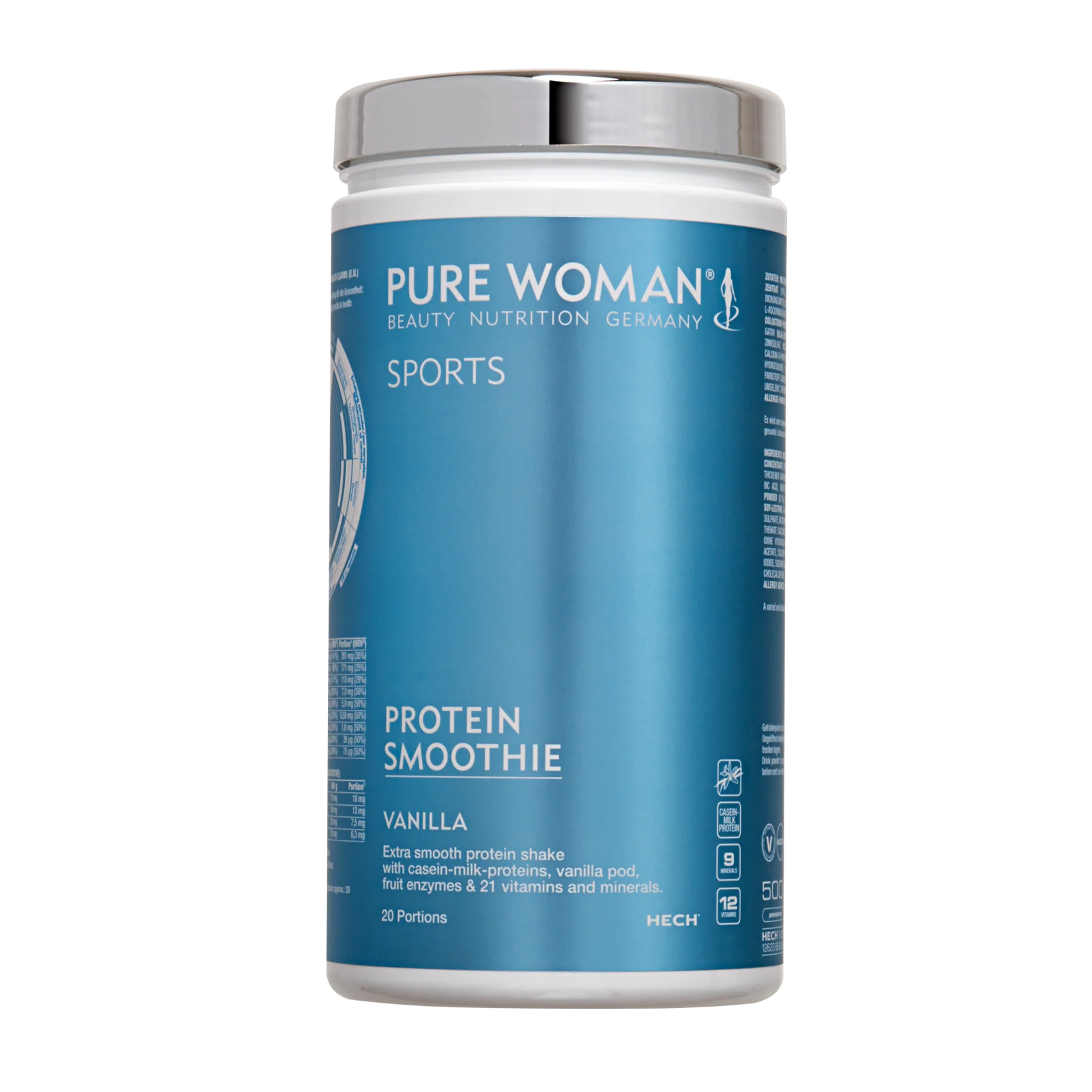 PURE WOMAN PROTEIN SMOOTHIE is a casein protein product, that has been enriched with whey proteins. The use of real vanilla pod or fruit pieces make for a maximum enjoyment. Protein Smoothie contains a comprehensive built-in spectrum of vitamins and minerals, lactase as well as fruit enzymes Papain (from papaya), Bromelain (from pineapple) and Actinidin (from kiwi). Aspartame free. Cyclamate free.